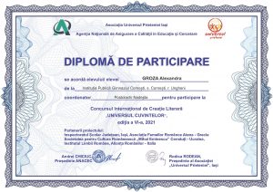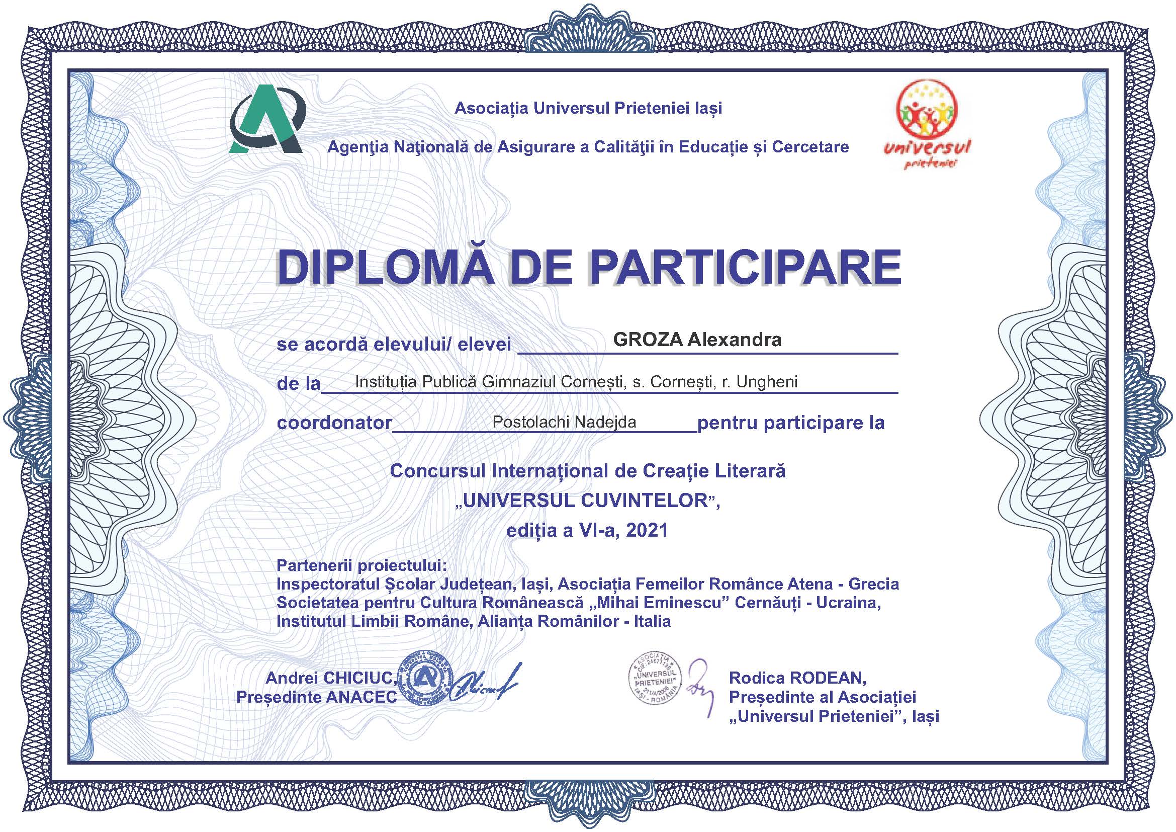 Concursul Internațional de Creație Literară „Universul Cuvintelor” s-a desfășurat în perioada 15 aprilie – 15 august 2021, fiind inițiat de Asociația „Universul Prieteniei”, Iași, în parteneriat cu Agenția Națională de Asigurare a Calității în Educație și Cercetare (ANACEC). Alături de concurenții din România și Republica Moldova, în această competiție școlară s-au mai încadrat elevi din Grecia, Ucraina, Franța, Italia. Elevii din IP Gimnaziul Cornești din satul Cornești, raionul Ungheni au fost menționați cu Diplome de participare. Succese mari elevilor și profesorului de limbăși literatură română Postolachi Nadejda, care le cultuvă dragostea de țară, grai matern!